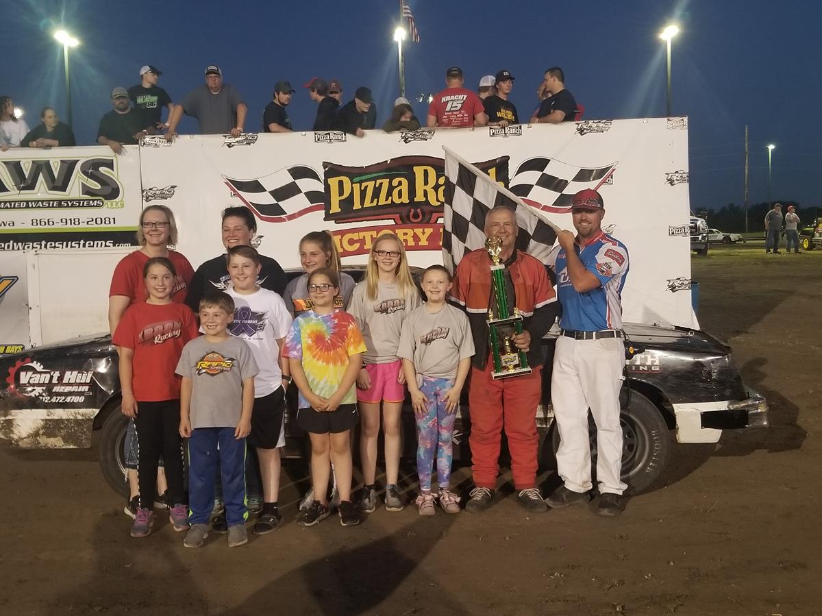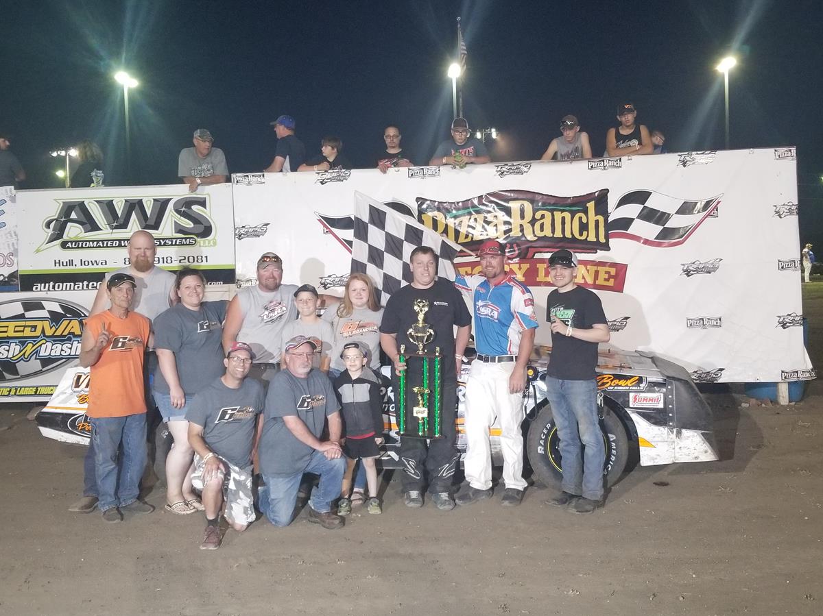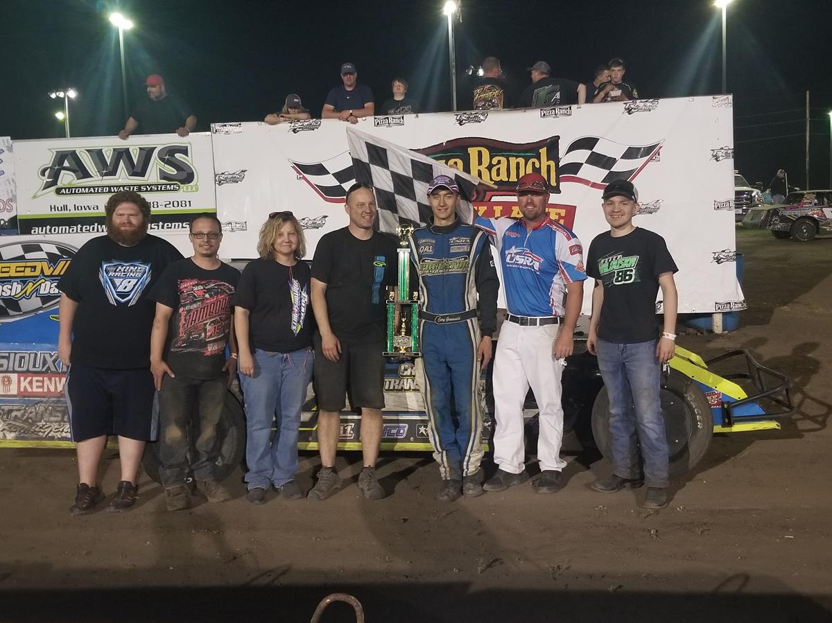 Feature action started as always with the Lems Auto Recyclers Sportsmans class and Bill Kroon became the first repeat winner in the class Friday night. Kroon lead from the get go with Brian Kroon chasing right behind him. After a caution on lap 4 Brian thought he had enough of a run on his dad to get by as he dipped low in turns 1 & 2, but no, Bill was able to pull away off of two and put some distance between the two Rock Rapids drivers. On the last lap Bill had all kinds of pressure on his back bumper from Brian, as well as Marni DeBoer. Heading into corner 1 Marni got too high and went off the track while Brian stayed in contention, but could never get by. “I knew they were there,” said Kroon in victory lane. Brian would finish 2nd followed by Gerold Steenhoven, Tyler Bradley, and Leon Sneller. Bradley and Deboer were the heat race winners.