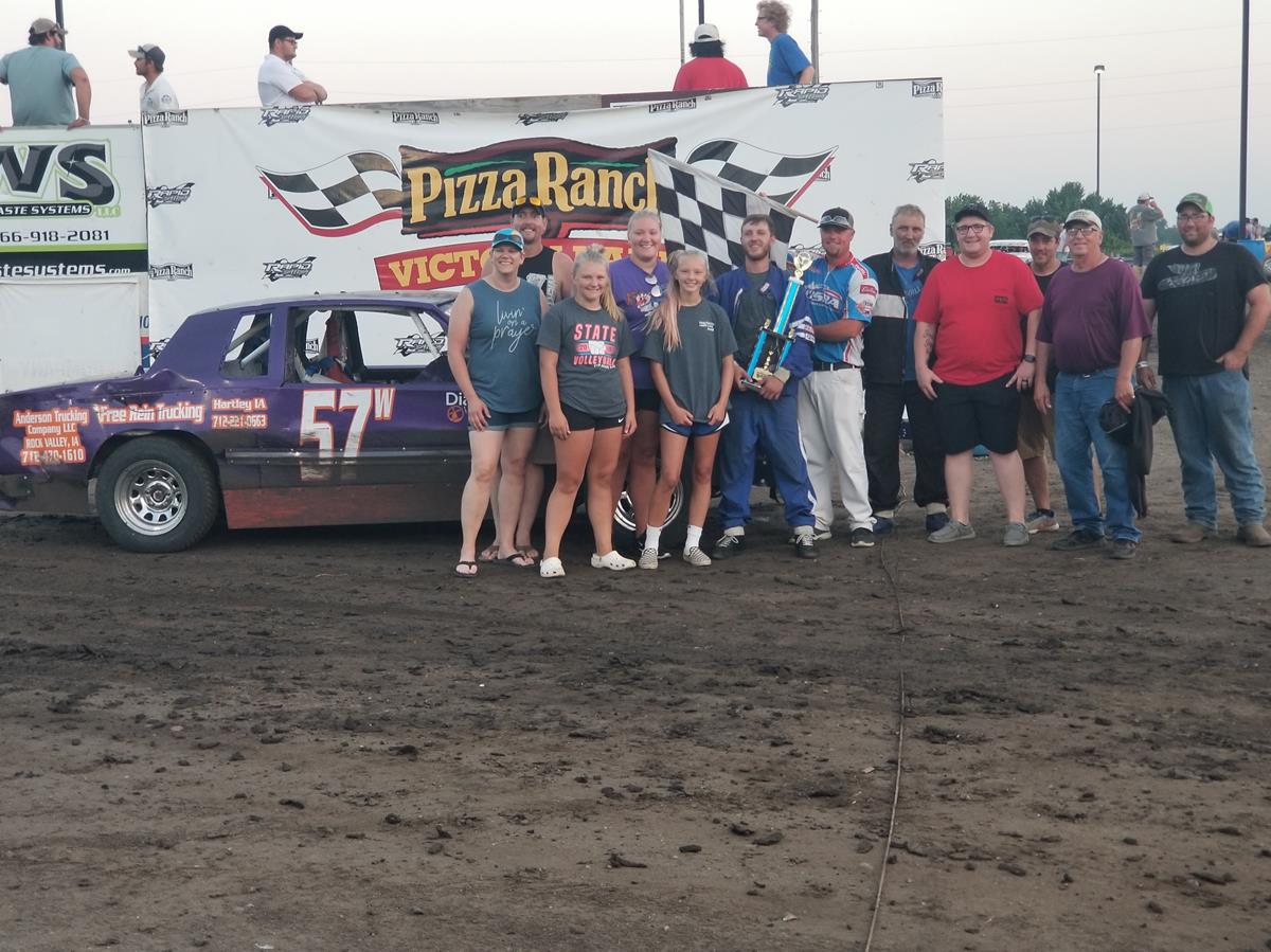 Fast and furious was the Precision Auto Body Stock Cars on Friday night. Current point leader Colten Arends would own the pole and look to win his 2nd feature in a row after last Saturday would jump out to the early lead, but Jon DeBoer would be hot on his tail. Just a few laps into the race DeBoer would show his power as he drove to the outside of Arends to take the lead bring with him the 5L of Dustin Larson. The 3 cars would be all over each other as the raced around the track and heading down the backstretch it was 3 wide for the lead. At that time Larson shot to the inside with DeBoer up to and Arends in the middle. Coming out of 4 Larson would have the lead and start to pull away. Behind the top three multiple cars were shuffling positions trading spots throughout the field while Larson kept extending his lead. A few cautions would keep the field close, but in the end it was Larson driving to his 4th win of the season. “Look what happens when the car doesn’t break!” exclaimed Larson as he climbed out of the car, noting his bad luck as of late. Arends would hang on to finish second ahead of hard charging Scott Overgaard coming from 15th to 3rd. DeBoer and Chad Lonneman would round out the top 5. Larson, Arends, Justin Regnerus were the heat winners.